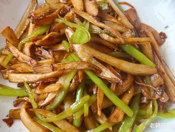 鍋熱下油,加入杏鮑菇,炒至金黃,加入蒜米幹辣椒爆香,加入一勺生抽,半勺老抽、一勺蠔油、一點點鹽、半勺糖、撒上孜然粉翻炒均勻,加入青椒絲炒至斷生即可開吃瞭