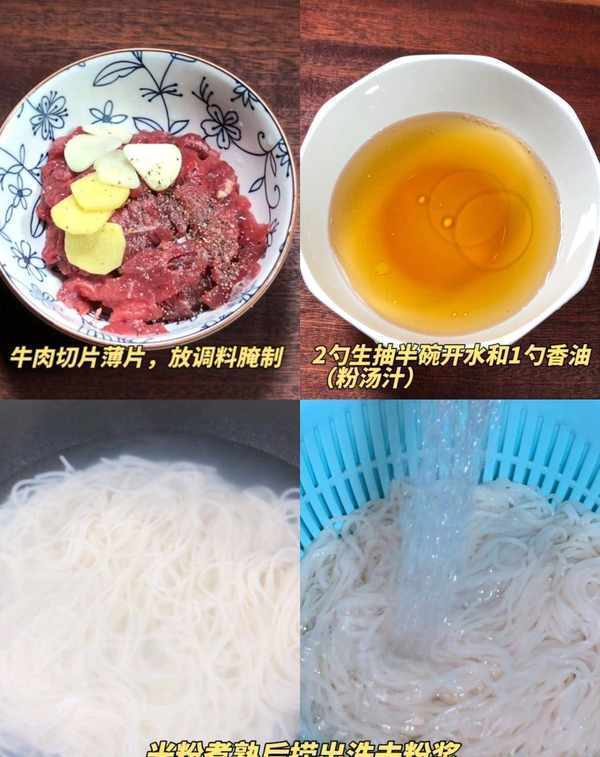 接著煮一小把米粉,煮熟後撈出過涼水,去除米粉表面的粉漿,備用。然後將生牛肉切成薄片,加入薑蒜、生抽、老抽、胡椒粉和紅淀粉攪拌均勻,最後加入花生油醃制10分鐘。