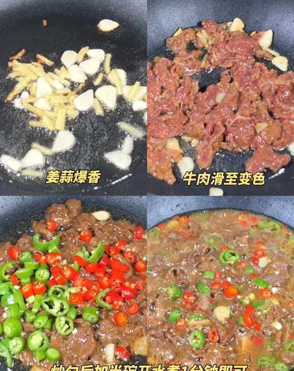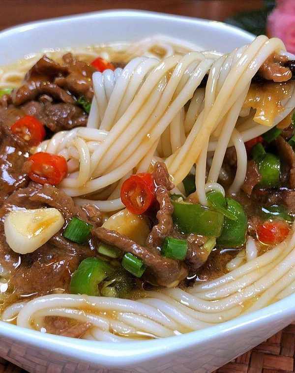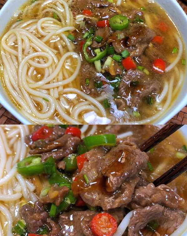 起鍋熱油,放入薑蒜爆香後,加入牛肉滑炒至變色,再加入青紅辣椒一起翻炒均勻,最後加入半碗開水煮1分鐘左右。碗裡加入1勺生抽、1勺香油和半碗開水,將煮好的米粉放進去,最後將炒好的牛肉蓋在米粉上即可。