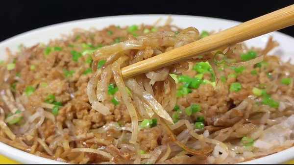 4、起鍋燒油,放入肉沫炒散炒香,把肉沫炒至顏色變白,再放入料酒、生抽、食鹽、胡椒粉、蠔油調味,再放入少許的清水,翻炒均勻就可以瞭。