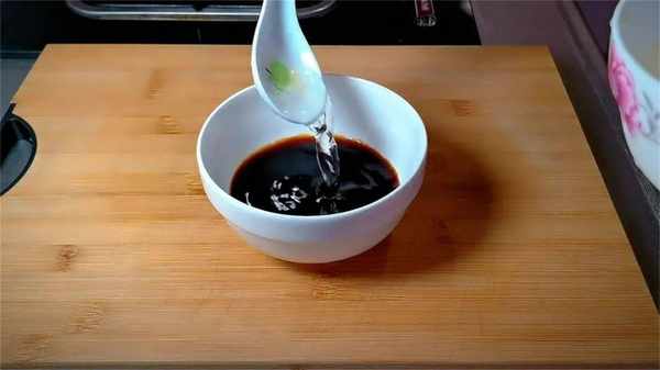 4、小碗調個料汁,放入生抽或蒸魚豉油三勺,再放一勺蠔油,兩小勺糖,幾滴老抽,兌三勺清水,攪拌均勻,放在一旁備用。