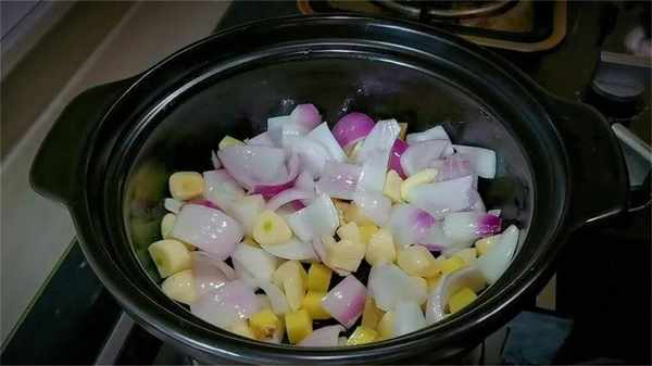 5、砂鍋中倒入少量的油,把這些配料倒進去,先攪拌一下,然後蓋上鍋蓋,開中火燜兩分鐘。這一步是為瞭逼出配菜的香氣。