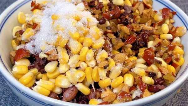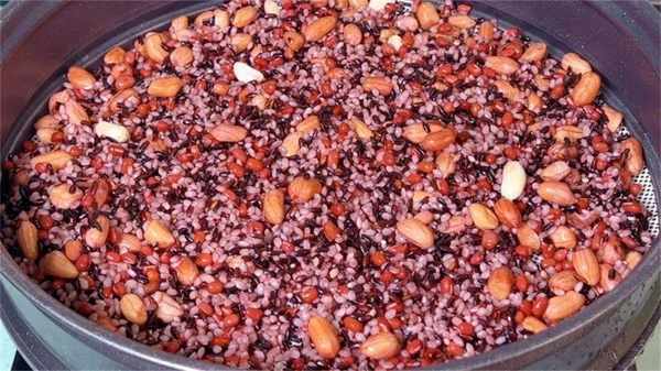 食材準備:紅豆、花生、黑米、糯米、葡萄幹、紅棗、玉米、糯米粉