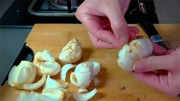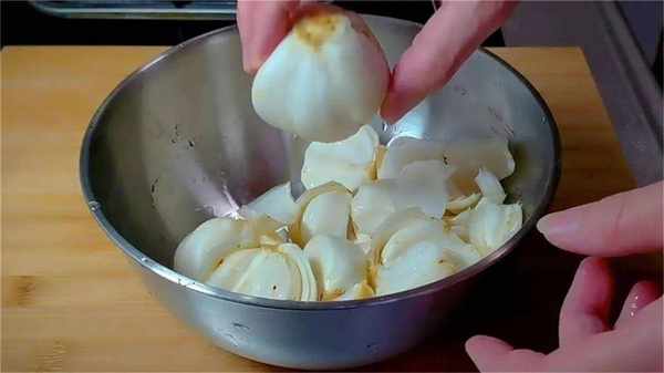 2、這個菜是用整個百合,不要掰碎,這樣好看,稍微掰掰松就可以瞭,把它浸泡在水中,清洗幹凈,再把裡面的水分甩出來。