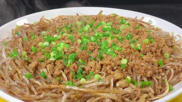 5、把炒好的肉末蓋在香芋絲上面,蓋好之後放在蒸籠上面,再蓋上蓋子,開大火燒開,上汽後蒸25分鐘,把香芋絲給它蒸軟。