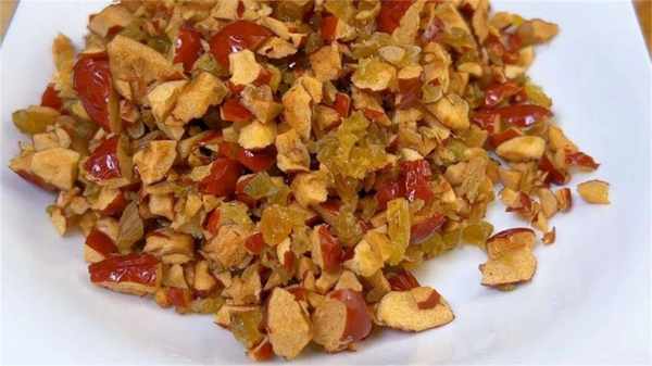 3、準備30克葡萄幹、30克紅棗,淋入少許的清水,把它們清洗幹凈,洗凈後控水撈出來,再用菜刀把它們切碎,切好後放入盆中備用。