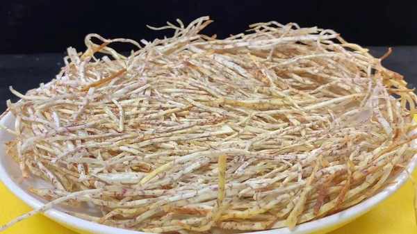3、鍋中倒入多一點的花生油,等油溫升至五成熱後,把香芋絲慢慢地倒進去,全程開中火慢炸,炸至三分鐘左右,炸至金黃撈出控油。