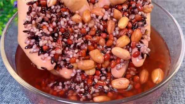 1、準備50克紅豆、50克花生、50克黑米、50克糯米,倒入清水沒過所有食材,把它們淘洗幹凈,再倒入適量的清水,浸泡一個晚上。