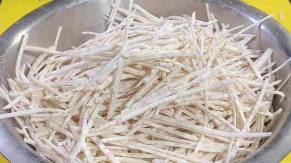 1、準備一個芋頭,用菜刀切去兩頭,然後削去外皮,再清洗幹凈,改刀切成均勻的薄片,再碼放整齊,切成粗細均勻的香芋絲,裝入盤中。