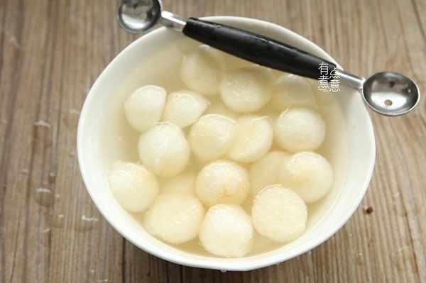 買雪梨時最好買這種比較大的貢梨,口感更脆美。水分也更充足。先把雪梨的皮削掉,用挖球的工具挖成雪梨球,沒有挖球工具,也可以直接切成塊,或者切成像橘子那樣一瓣瓣。把挖出來的雪梨用淡鹽水浸泡著防止氧化。