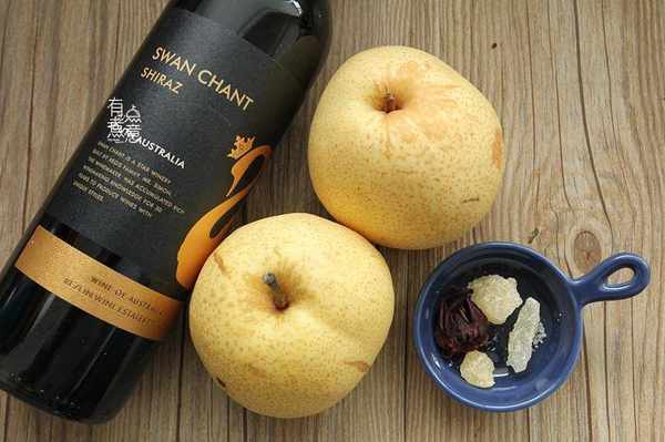 食材準備:紅酒 適量、雪梨 2個、洛神花 一朵、冰糖 3塊