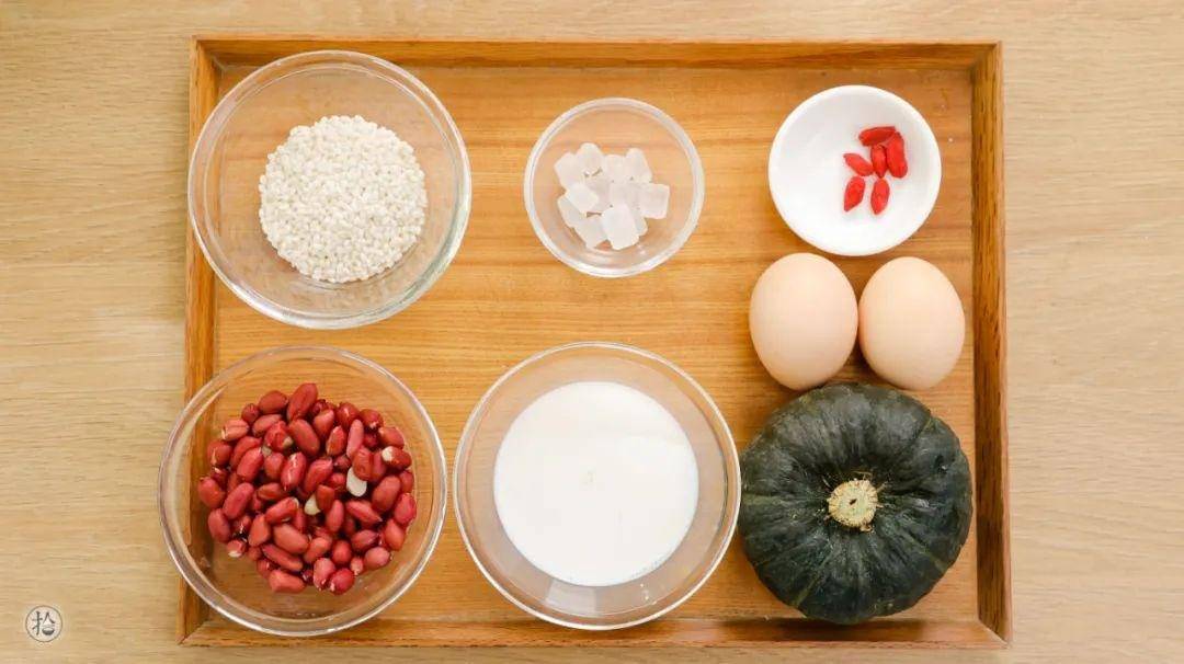 食材: 貝貝南瓜/1個、雞蛋/2個、牛奶/120g、花生/100g、糯米/50g、冰糖/5g、枸杞/適量