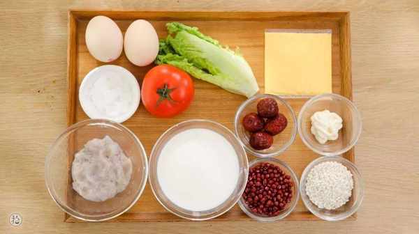 食材: 雞蛋/2個、蝦泥/100g、番茄/適量、生菜/適量、芝士片/一片、沙拉醬/適量、冰糖/5g、牛奶/200g、紅棗/4顆、紅豆/80g、糯米/60g