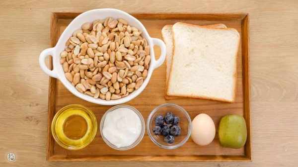 食材: 熟花生/500g、核桃油(或植物油)/20g、酸奶/100g、吐司/2片、藍莓/適量、雞蛋/1個、奇異果/一個