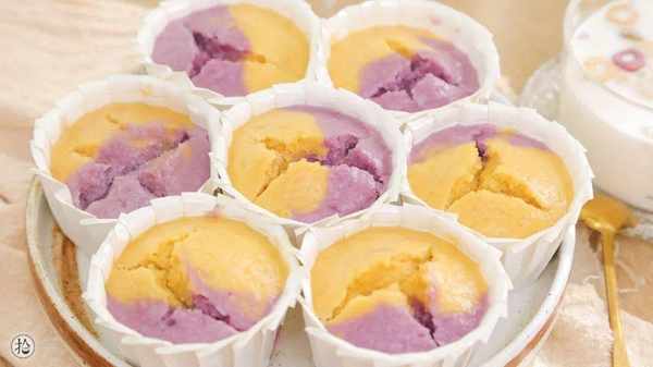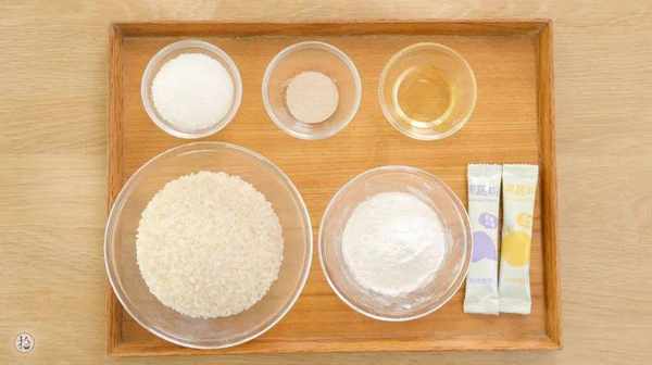 食材: 大米/300g、清水/300g、細砂糖/20g、酵母/3g、中筋面粉/100g、植物油/10g、紫薯粉、南瓜粉/各5g