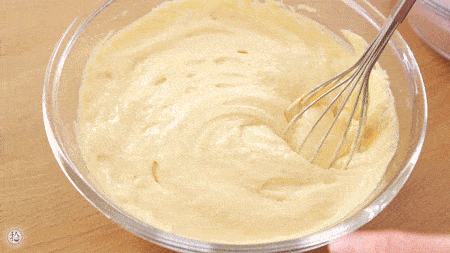 2.把面粉加入米漿裡,加入酵母、植物油,用蛋抽攪拌至細膩無幹面粉的狀態。
