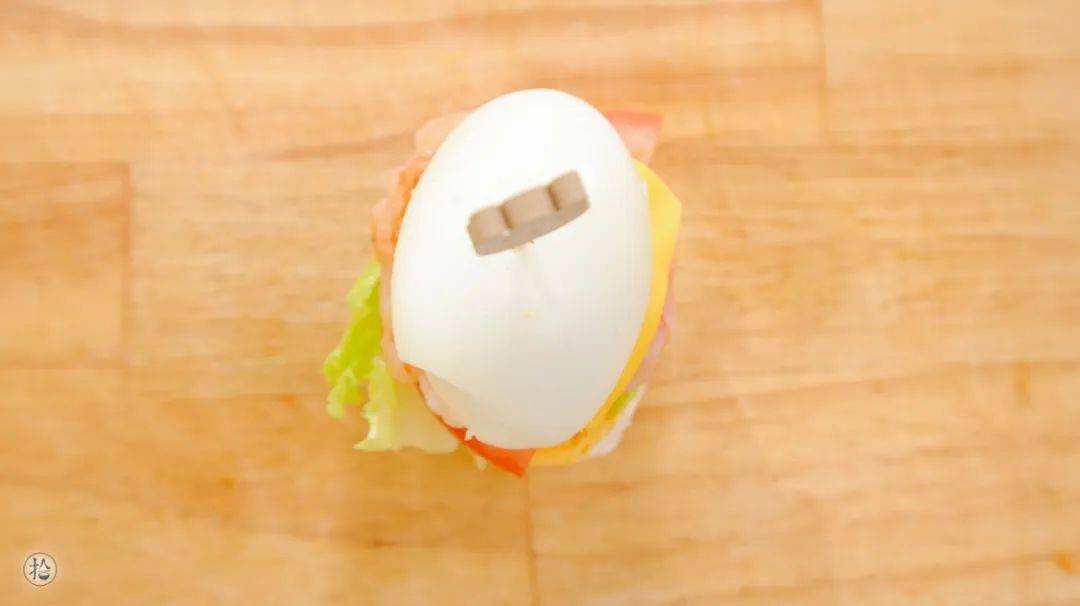 5.再放上蝦餅、芝士片、雞蛋,最後用竹簽固定住就可以瞭。