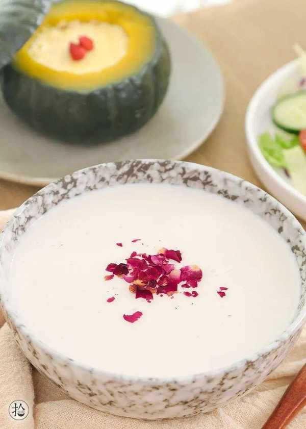 香稠爽滑的花生酪更加錦上添花,醇香可口,潔白無瑕,口感也很細膩,點綴些幹玫瑰碎,紅白相間看起來更精致更有食欲,比豆漿好喝,營養價值也更高。