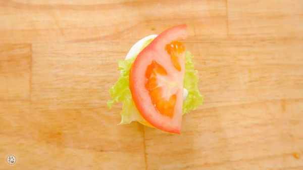 4.把煮好的雞蛋去皮後一分為二,放上生菜、沙拉醬、番茄片。