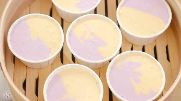 3.米漿分成2份,分別加入紫薯粉和南瓜粉,攪拌均勻蓋上保鮮膜,室溫發酵至兩倍大。(Tips:這一步可以提前一晚做,放入冰箱冷藏低溫發酵,冷藏發酵的時間最好不要超過10個小時,避免發酵過度)