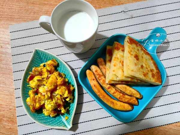 第二天早餐~熱牛奶+煎魚腸+烙油餅+蔥花煎蛋