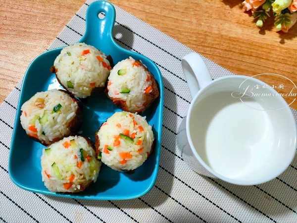 飯團需要睡前把米飯用電飯煲預約上,少摻入一些糯米增加粘性。早起的時候米飯是熱氣騰騰的,做飯團剛剛好。