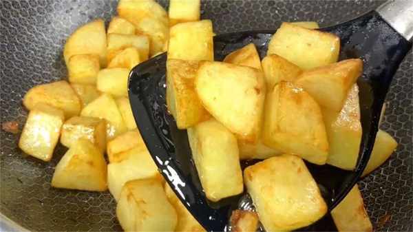6、鍋熱倒入食用油,把土豆倒入鍋中,開中小火慢慢煎,把土豆表面煎至金黃酥脆,這樣土豆吃起來才更加香。
