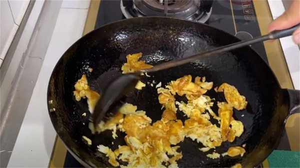 9、為瞭更營養好吃,可以再煎一個蛋餅。起鍋放上少許油,倒入打好的蛋液,煎至四面金黃以後,把雞蛋搗成小塊。