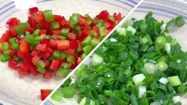 3、準備少許的青紅椒,先改刀切成絲,最後給它切成小丁,切好後裝入盤中,再準備一把清洗幹凈的小蔥,切成蔥花備用。
