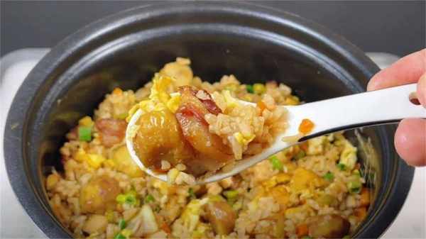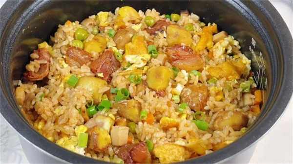 10、米飯煮熟後,放入煎好的雞蛋,撒上蔥花點綴,攪拌均勻,一道超級好吃的板栗燜飯就做好瞭,有菜有肉,有飯有蛋,簡單營養又解饞。