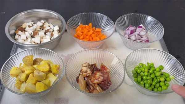 4、準備配菜,板栗剝開外殼,切成小塊,香菇洗凈後切小塊,胡蘿卜去皮後切小塊,洋蔥切成小塊,再準備少許臘肉和青豆。
