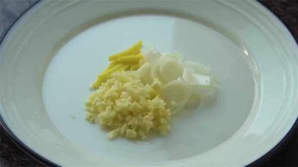 3、準備配料,適量的蔥薑蒜,大蔥切成片,生薑去皮切成細絲,大蒜洗凈切成碎末,全部切完之後,裝入盤中備用。
