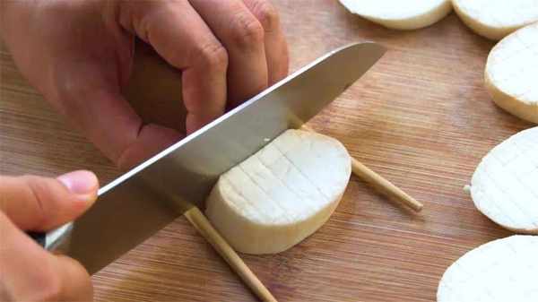 1、準備兩個大小適中的杏鮑菇,洗凈後切成厚片,接著用兩根筷子放在兩端,再橫豎切成網格狀,切成這樣就可以,全部切完備用。