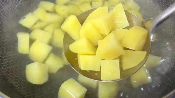 5、鍋中水燒開後,把土豆放入鍋中,開大火把煮2分鐘,將土豆煮熟煮透,口感更加軟糯,煮好後控水撈出,放入涼水中過涼。