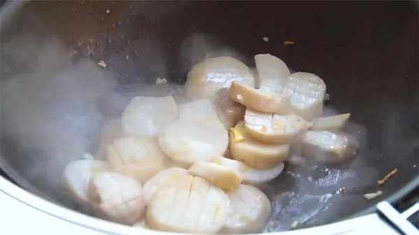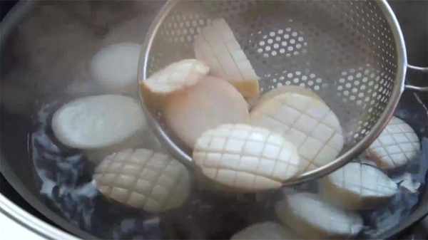 2、鍋內加入適量的清水,開大火燒開,倒入杏鮑菇,焯水30秒左右,焯水時間不能太長,時間到後即可撈出來,控幹水分後備用。