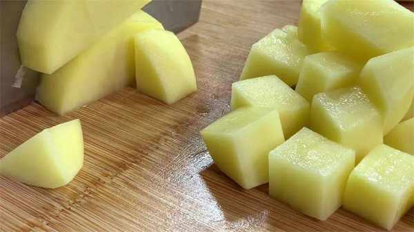 1、準備兩個土豆,用刮皮刀刮去外皮,去皮之後再切成厚片,再把改刀切成粗條,最後切成小方塊,全部切好後裝入大碗中。
