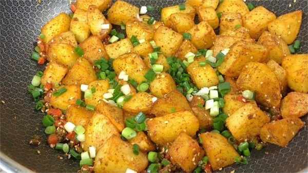 7、再放入青紅椒丁和椒鹽料,開小火翻炒均勻,讓每塊土豆都能均勻的裹上調味料,再把小蔥花放進來,翻炒均勻後即可關火出鍋。