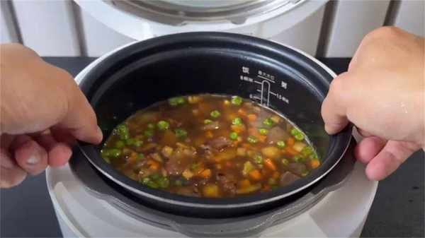 8、最後把泡好的大米放到電飯鍋中,倒入調好的湯汁和各種蔬菜,放到電飯鍋中,接下來按下米飯鍵,坐等美味就可以瞭。