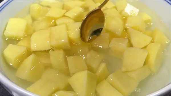 2、然後加入沒過土豆的清水,再加入少許的白醋,這樣可以防止土豆氧化變黑,攪拌均勻後先放一旁浸泡十分鐘。