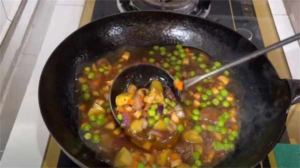 6、一分鐘以後,再放入板栗、青豆,簡單翻炒兩下,再加入少許生抽、鹽提鮮提味,一點點老抽調下底色,增加醬香味。