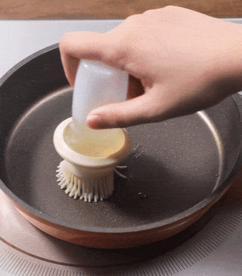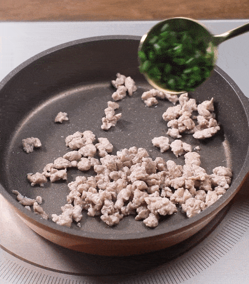 4.平底鍋刷油,倒入肉餡,炒散至變色。