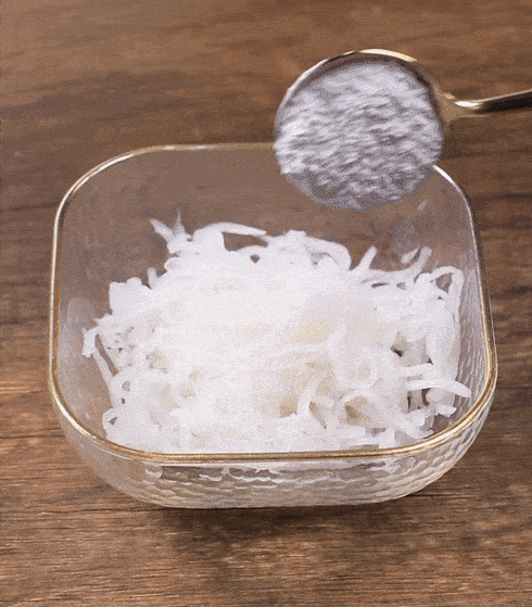 3.白蘿卜去皮後擦絲,加少量鹽,醃制15分鐘,擠出水分。用清水再沖洗一遍,再擠幹水分。