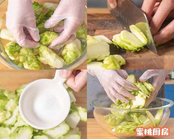 1.兒菜買回來清洗幹凈,瀝幹表面水分,放在案板上切成薄片,裝入大碗中;加入適量的鹽,抓拌均勻醃制15分鐘出水
