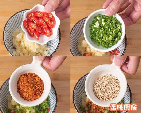 涼拌汁:蒜末35g 小米椒圈3個 辣椒面10g 熟白芝麻5g 蔥花10g 熱油30g 生抽20g 蠔油20g 香醋15g 白砂糖8g 花椒油5g