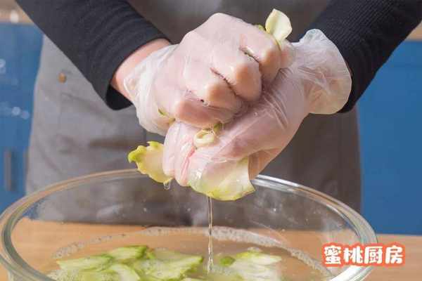 2.將涼白開倒入醃制好的兒菜中,清洗掉多餘的鹽分,擠幹水分備用