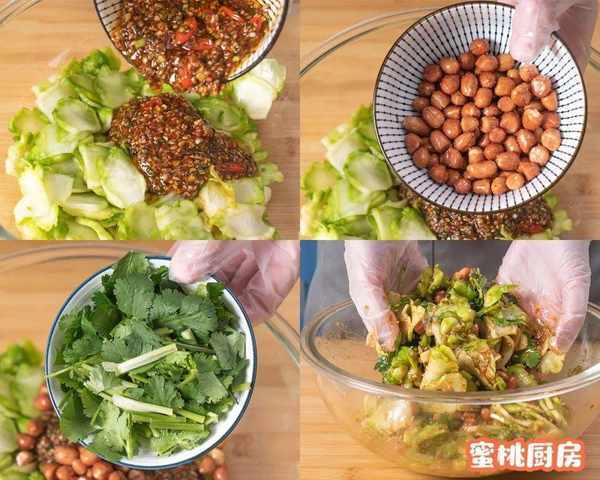 4.將制作好的涼拌汁倒入兒菜中,再加入熟花生米和香菜段,抓拌均勻醃制10分鐘即可開吃