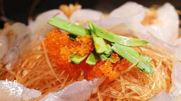 放上15g飛魚籽和10g韭菜段。