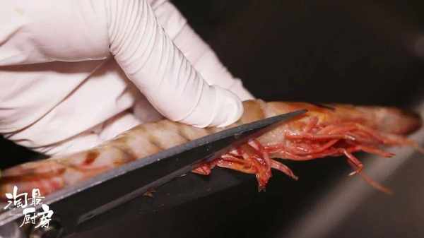 用剪刀剪去蝦須,剝出蝦仁。