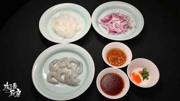 / 食材 / : 8隻蝦仁、150g粉絲、50g洋蔥絲、15g飛魚籽、10g韭菜段