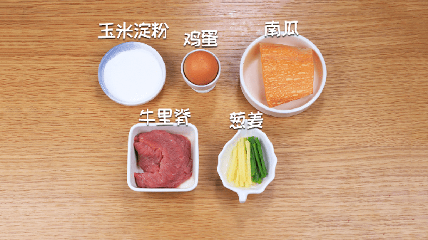 準備食材:南瓜100克,牛裡脊80克,雞蛋1個,玉米淀粉15克,蔥薑適量